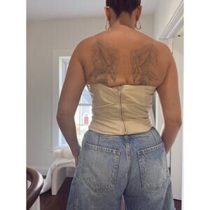 Iconic House of CB corset top in Fog (grey taupe). Asymmetrical neckline, vegan leather with boning for structure, fully lined, back zipper. Brand new with tags, sold-out style.