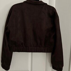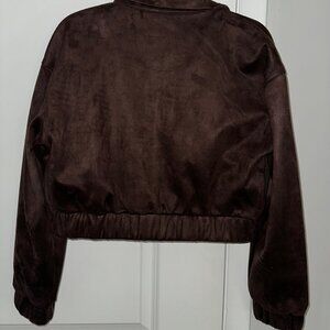 Elegant, rich brown, faux suede, bomber jacket with a sleek zip-up design.