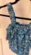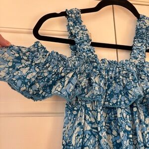 Elevate your wardrobe with this stunning House of Harlow 1960 Martine Blue Print Top, perfect for any occasion. This size small blouse features a colorful blue floral pattern, off-the-shoulder neckline, and strappy sleeves with ruffle and strap accents. The collarless blouse has a pullover closure, making it easy to wear for travel, vacation, or this summer’s festival.