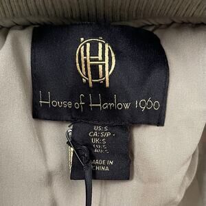 Add some edge to your style with this NWT House of Harlow 1960 satin bomber jacket, perfect for travel and casual occasions. The jacket features a zip and snap closure, buckle and zipper accents, and elastic waist for a relaxed fit. With a solid pattern and sage green color, this jacket is ideal for the fall, winter, and spring seasons.