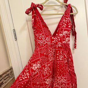 NWT House of Harlow Red Floral Linen-Blend Dress with Tie Sleeves