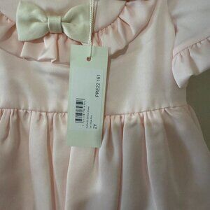 NEVER WORN - brand new with tag and hanger. Pink satin dress for girls by Hucklebones. Made from soft and lightweight satin poly. it features the pretty ruffle on the front with satin bows in pink, white and rose gold and it has a trimmed ruffles on both hem sleeves. It fastens with concealed zip at the back and underlayers has a cotton voile lining with a soft tulle to add extra volume.