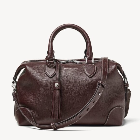 "Contrast stitching on reinforced base corners is complemented by Aspinal shield-inspired handle bases, while a removable tassel charm brings playful sophistication.