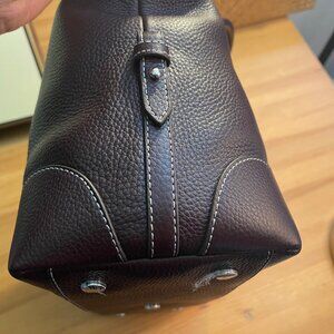 -Dark red/burgundy pebbled leather, silvertone hardware.