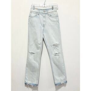 The Jade High-Rise Straight Leg Jean in light indigo Aries is cut with a loose, ’90s-inspired fit from premium stonewashed and destructed denim . Features a hint of stretch for extra comfort, a button/ zipper closure, and 5 pocket design. Made from premium stretch denim that has been expertly distressed across the knees and thighs with a raw hem.