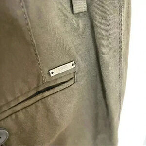 Description: Slim fit unfinished brown suit pants. Side pockets. Hugo Boss metallic hardware on backside.