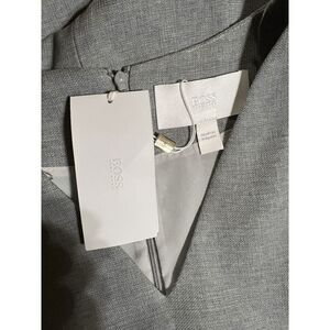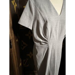 Super classy gray sheath dress by Hugo Boss. Features cap sleeve, v neckline, zipper in the back, and pleated sides for a more tapered fit. Dress is lined and made of 100% Virgin Wool. Measurements are bust 46", waist is 36" and shoulder to hem is 40".