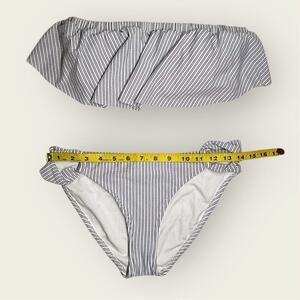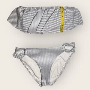 Description: Stylish and playful blue and white striped bikini set. The bandeau-style top features ruffle detailing for a flirty beach look, while the bikini bottoms come with cute bow accents on the sides. Perfect for lounging by the pool or hitting the beach.