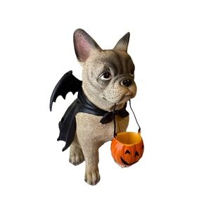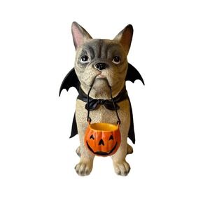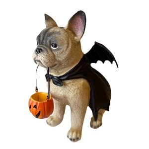 The NWT Humane Society Halloween Dracula Frenchie French Bulldog Dog Statue is a medium-sized figurine made of resin, featuring a brown French Bulldog character perfect for Halloween