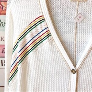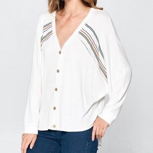 Long sleeve, v-neck, front button trim, and stripe contrast detail