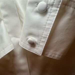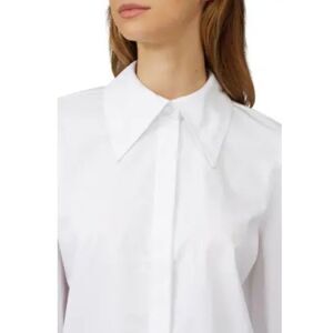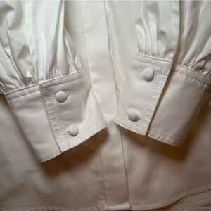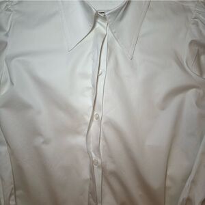 White cotton (95% Cotton, 5% Polyurethane). Top. Long sleeves. Shirt collar neckline. Exposed front button down closure. 20" from shoulder to hemline