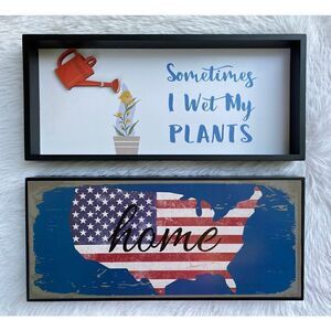 NWT 1 Huntington Home reversible horizontal plaque sign. *Shadow box on one side and decorative design on the other side *Sometimes I Wet My Plants" on the shadow box side *”Patriotic Home" on the other side *15.88" L X 7" H *Perfect for indoor and outside patio decor *Two signs in one *Unique designs Super cute and fun! Great gift for yourself or family and friends. Farm house water can decor on one side and flip to patriotic! If you have any questions please let me know. Thank you ☺️