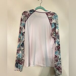 Stylish long sleeve rash guard with floral sleeves. Perfect for beach or pool.