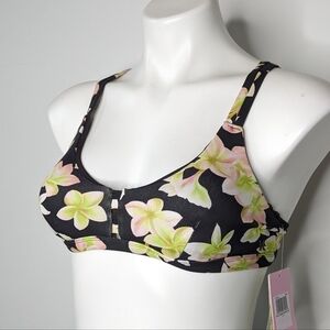 NWT Hurley x Carissa Moore black floral Max Plumeria Scoop bikini top XS. Removable pads. Black with yellow/green & pink flowers.