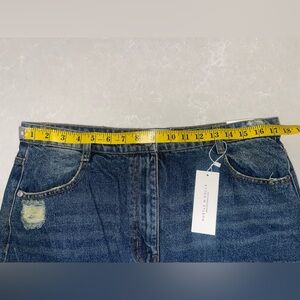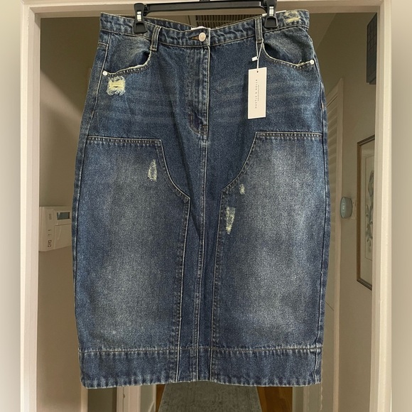 Stylish Harlow 5 pocket denim skirt featuring distressed details. Button fly. Back slit.