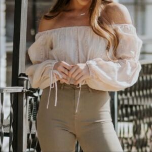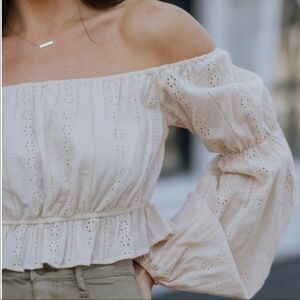 NWT Hyfve Top Off Shoulder Eyelet Lace Crop Long Balloon Sleeve Beige Color