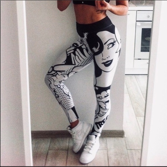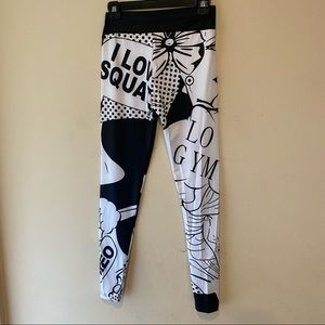 NWT “I LOVE SQUATS” COMIC STRIP DESIGN BLACK WHITE LEGGINGS SIZE SMALL