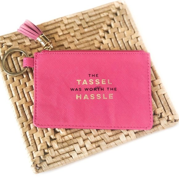 An ID & key holder with varying phrases on them