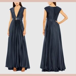 NWT IEENA MAC DUGGAL [ 2 ] 26285 Pleated Plunge Neck Belted A Line Gown Midnigh
