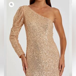 NWT IEENA MAC DUGGAL Gold Sequined One Shoulder Trumpet Gown dress Sz 10