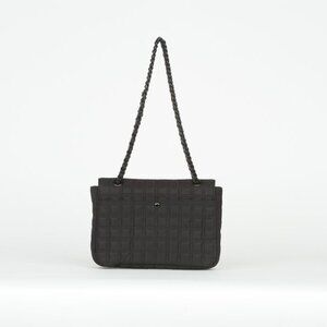 Buckle closure, adjustable chain shoulder strap, square quilting design, rear magnetic snap slip compartment