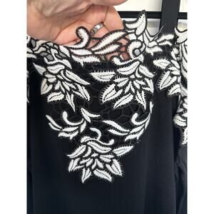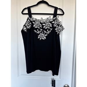 Wrapping around the shoulders, the neckline of INC International Concepts' plus size top is fashioned from wispy floral appliqués. Extra shoulder straps offer bra-friendly support.