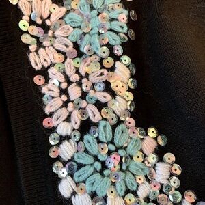 Cap sleeves with embroidered yarn and sequins. Has hook closure at top. Pretty sparkle. Sweater is very soft.