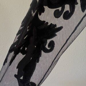 Ribbed neckline; cutout at front; flocked velvet at illusion sleeves