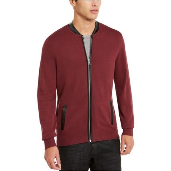 NWT INC International Concepts Men Zip Up Faux Leather Trim Burgundy Cardigan