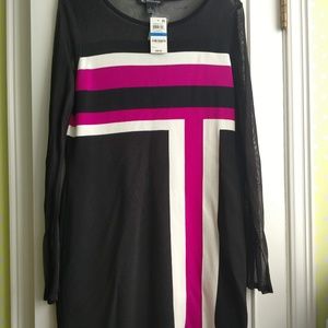 Black, magenta and white sweater dress with mesh neckline and sleeves. Knee length. Never worn, NWT