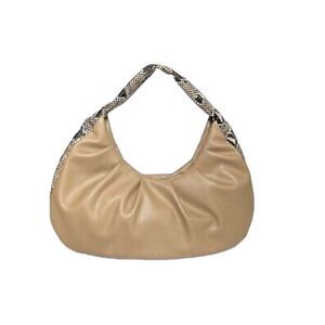 Tan faux-leather with textured snake trim on the sides and top handle. Small hobo style.
