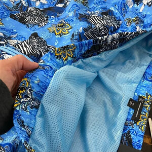 NWT INC Mens blue zebra print swim trunks with elastic waist and draw string, lined, front slant pockets, back pockets NWT, amazing print!