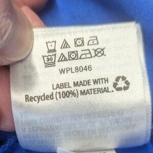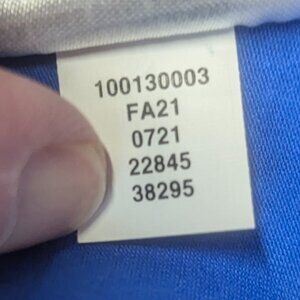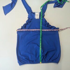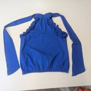 This will turn heads! Choker neck, secured at back with 3 cloth-covered buttons, and a large keyhole beneath. Long ties that you can choose how to wear, whether knotted, bow-tied, or left hanging, and at either side or back. Ruffles around arm openings, and an elastic waist. This is a gorgeous, vivid blue that will make you look and feel your best, and it's brand new!