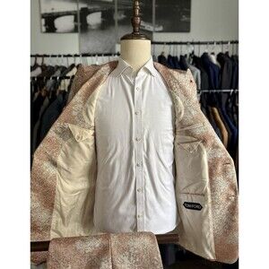 For sale we have here an INCREDIBLY luxurious and magnificent coral/peach base with shimmering cream floral pattern Tom Ford suit set. The fabric is an incredible blend of 81% metallic fibers and 19% cotton, complemented by a silk-blend interior.