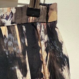Stylish skirt with an abstract pattern. Features a mix of black, cream, and tan colors. Perfect for a chic look.