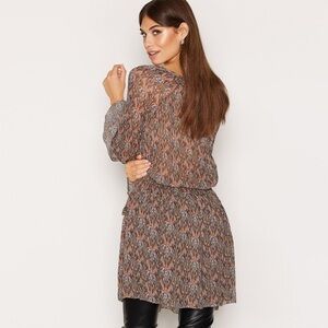 Keywords: Navy and red dress, Smocked waist dress, Long sleeve printed dress, Ruffle detail dress, Drawstring neckline dress, Lightweight fashion dress, Fully lined elegant dress, Designer IRO dress, Swirling Print, Feminine Ruffles, Smocked Detail, Long Sleeved