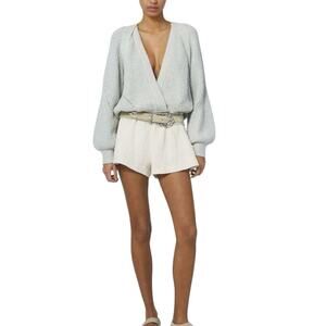 Muted blue-green tone sweater. Slip this piece of Parisian elegance on. A luxurious blend of cotton and organic cotton in a dreamy blue-green hue. This wrap-style knit features a plunging neckline, voluminous blouson sleeves, and a ribbed waistband that flatters the silhouette. The diagonal knit texture adds subtle drama, making it a standout piece for layering or solo styling.