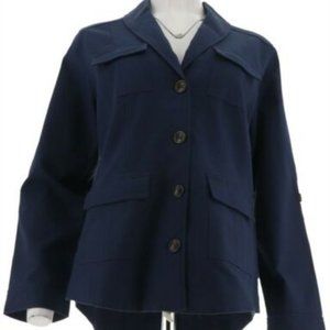 NWT (NEW IN BAG) ISAAC MIZRAHI LIVE! BUTTON FRONT SHAWL COLLAR UTILITY JACKET SIZE 12. COLOR IS DARK NAVY.