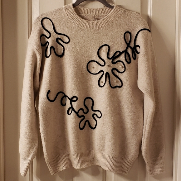 NWT! ITALIAN IMPORT Elegant Cream Sweater with Black, Diamond & Pearl Accents