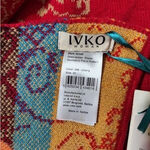 NWT IVKO Woman Red Jacquard-knit Folk Floral Pattern Shawl Scarf Soft and colorful, this wool shawl in a rich ornament pattern is your perfect accessory to any outfit. You can fold it loosely around the neck or casually throw it over the shoulders. Jacquard-knit folk Geometric floral pattern 62" wide 31" long There is a small flaw in the knit, you can see in the last 2 pictures. It wont be noticeable if you have longer hair or if you fold it over to cover it. IVKO Woman is made in Serbia. Their style reminds me of Gudrun Sjoden style. Like Free People, Anthropologie, Urban Outfitters, Asos.