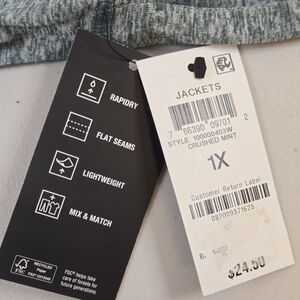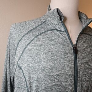 Ideology Rapidry lightweight jacket, beautiful heathered green color, size 1X. Full zip front, stand-up collar, thumb holes. Visible seams to add shaping. Very soft 100% polyester fabric.