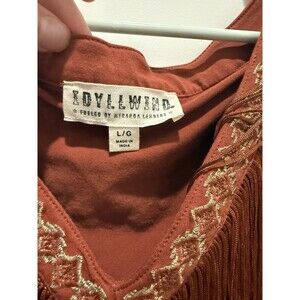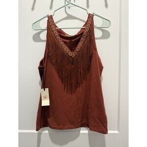 The NWT Idyllwind Coastal Cowgirl Songstress Embroidered Fringe Cotton Tank Top in size L is a stylish and versatile addition to any woman's wardrobe. This sleeveless top features a V-neckline and is made from lightweight cotton material, making it perfect for all seasons. The brown color and cowgirl character are showcased through intricate embroidered accents and fringe detailing, giving off a Western and Bohemian vibe. With a regular fit and basic style, this tank top is a must-have for any fashion-forward individual looking to add a touch of boho chic to their ensemble.