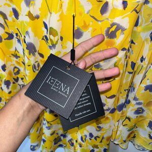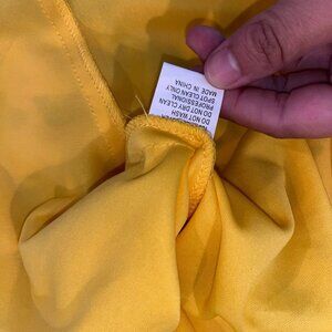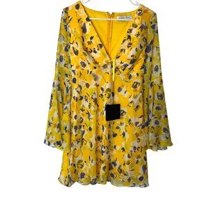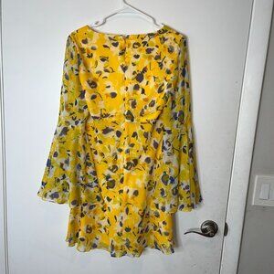 Bright and breezy, this vibrant yellow floral dress with bell sleeves and a flattering V-neck is ideal for stylish, warm weather outings.