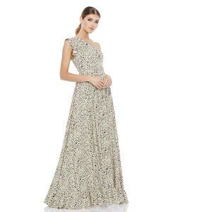 One-shoulder ruched animal print gown with a single flutter sleeve and a flowing, floor-length skirt.