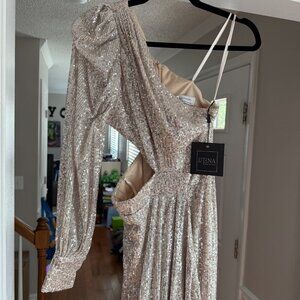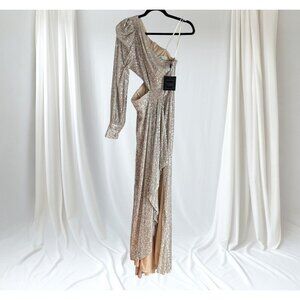 NWT Ieena for Mac Duggal Dress Silver One Shoulder Sequin Gown Slit Formal