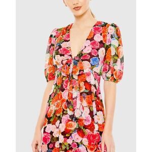 NWT Ieena for Mac Duggal Floral Print Front Tie Puff Sleeve Flowy Midi Dress in rose multicolor. This captivating ensemble boasts a vibrant floral print that exudes charm and sophistication. The front tie detail adds a touch of elegance, while the puff sleeves offer a playful and feminine silhouette. Crafted from flowing fabric, this midi dress ensures both comfort and style, making it perfect for any occasion, from brunch with friends to a garden party. Size 16.