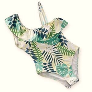 Matching swimsuits for family.IFFEI family matching one piece monokini printed leaf in off white background, featuring one shoulder asymmetric ruffle design for women swimwear.