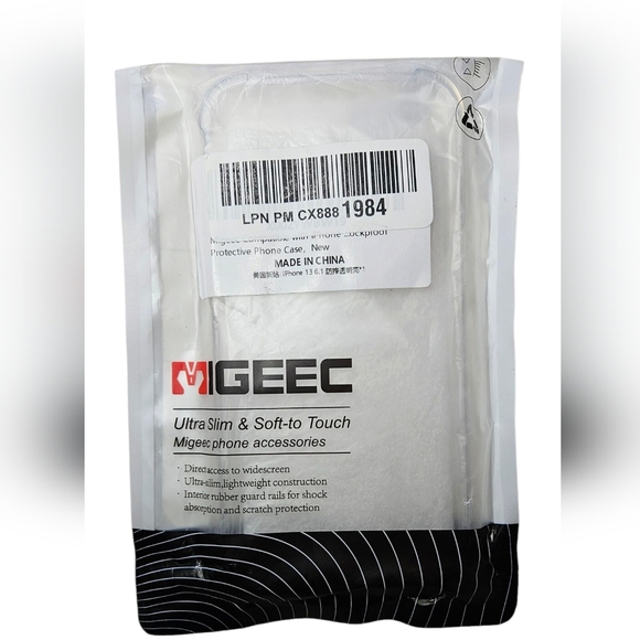 NWT - Igeec ultra slim and soft-to-touch clear phone case. Features anti-fingerprint and anti-scratch protection. Designed for a wide screen. Compatible with the iPhone. Never opemed or used. Made in China.