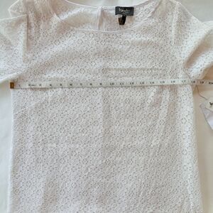 A sheer white overlay of delicate geometric lace defines a mod shift styled with 3/4 length bell sleeves and a satin-banded hem. Slips on over head.