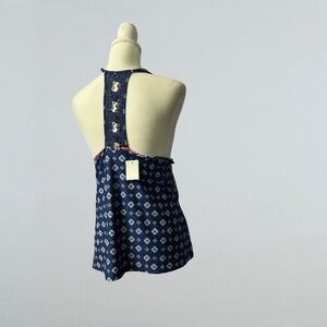 Smart print details on this lightweight fabric with boat neckline and crochet razorback V offers comfort. Polyester/spandex.